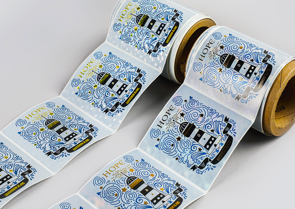 Wine label with cold foil and embossing featuring 2 different foil patterns